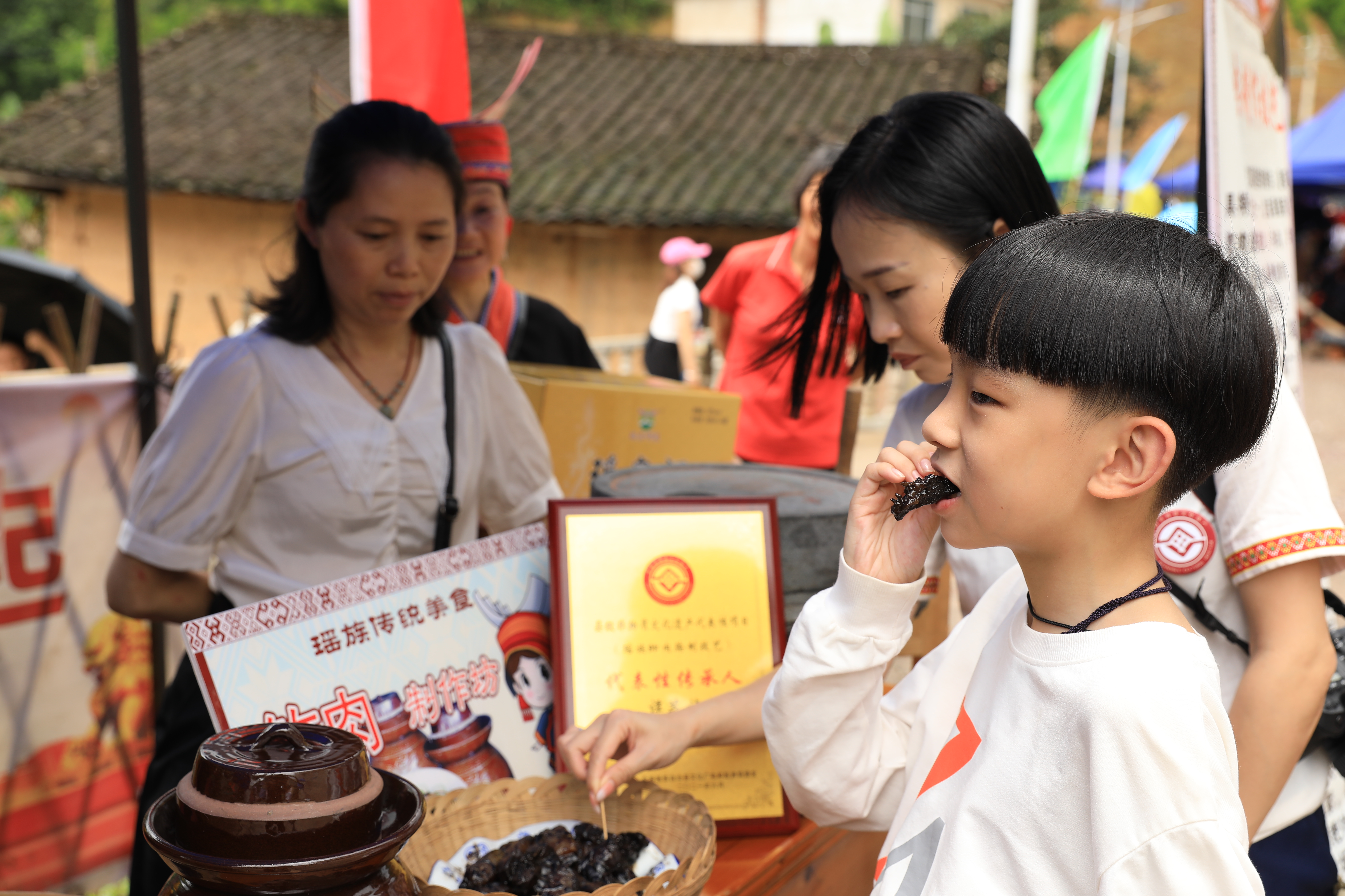游客品尝 瑶族祈宁盛宴美食