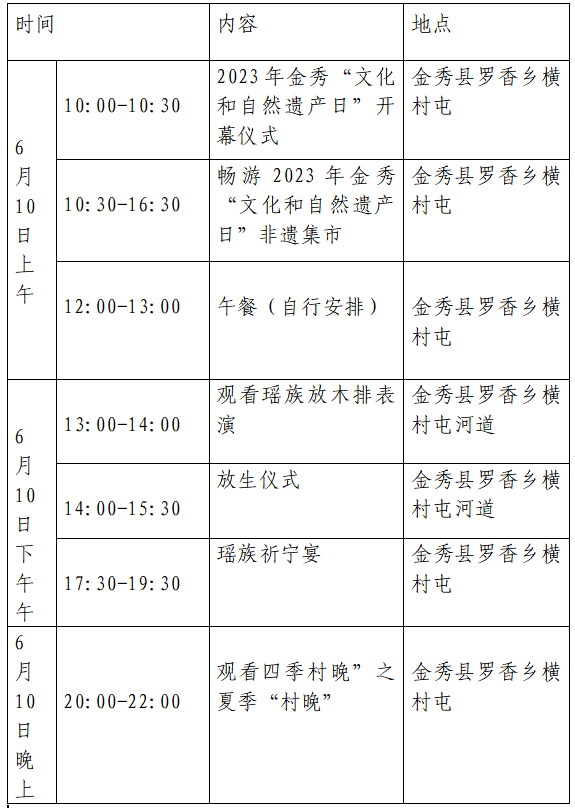 2023年“文化和自然遗产日”是6月10日,这一天,将在金秀县罗香乡横村屯举办2023年金秀“文化和自然遗产日”暨四季“村晚”之夏季“村晚”。活动内容丰富多彩。