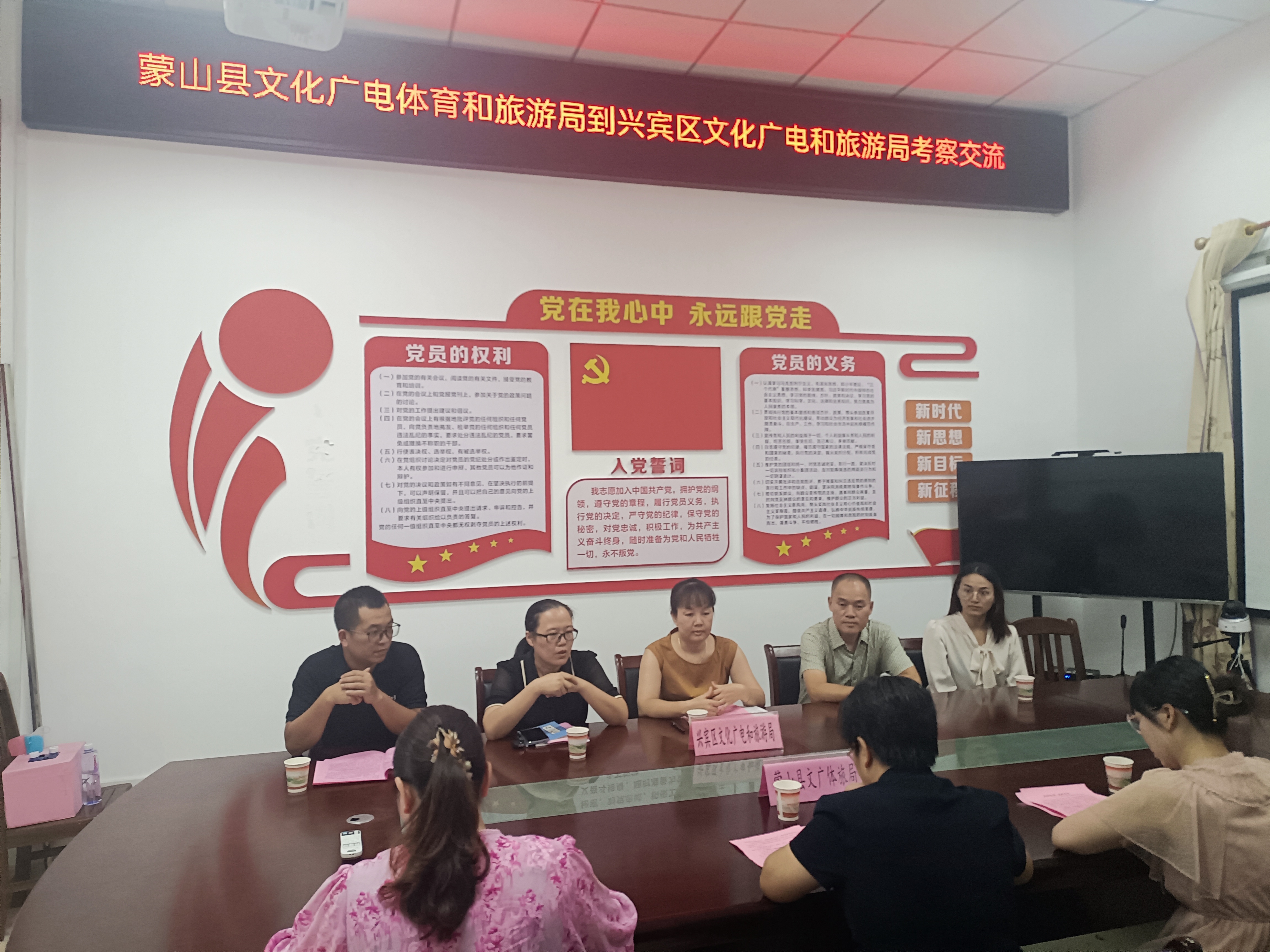 在交流座谈会上,黄彪副局长代表兴宾区文化广电和旅游局对廖清梅局长一行的到来表示热烈欢迎,希望通过开展这样的文流活动加强兴宾区与蒙山县之间在文化、旅游、广电领域方面的交流与合作。兴宾区图书馆、文化馆两位馆长分别详细介绍了我区图书馆、文化馆建设工作、开展情况与工作成效,并与参会人员相互交流了总分馆建设经验、做法。