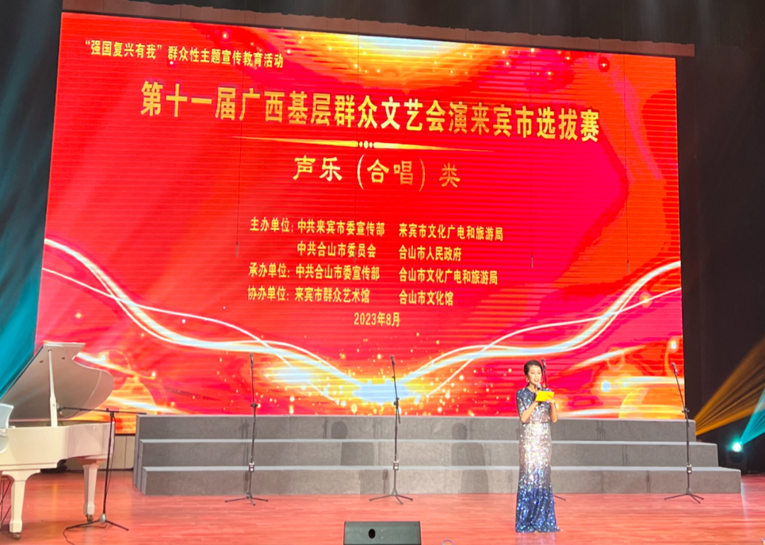 8月23日晚上,第十一届广西基层群众文艺会演来宾市选拔赛声乐(合唱)类在合山市工人文化宫开展,连续举办十一届的广西基层群众文艺会演来宾市选拔赛顺利启动!本次选拔赛由市委宣传部、市文化广电和旅游局、合山市委、合山市人民政府主办,合山市委宣传部、合山市文化广电和旅游局承办,来宾市群众艺术馆、合山市文化馆协办。