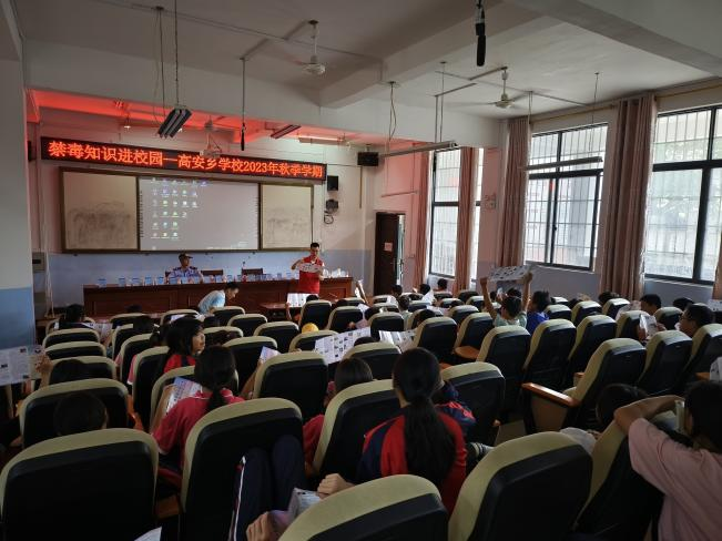 为进一步抓好青少年毒品预防教育工作,加强广大师生对毒品危害的认识,增强自我保护意识,营造良好的学习生活环境。在2023年秋季学期开学之际,高安乡党委政法委员、武装部部长彭宾镇组织派出所、社区戒毒社区康复工作站到高安乡学校开展“开学第一课”毒品预防教育宣传活动。