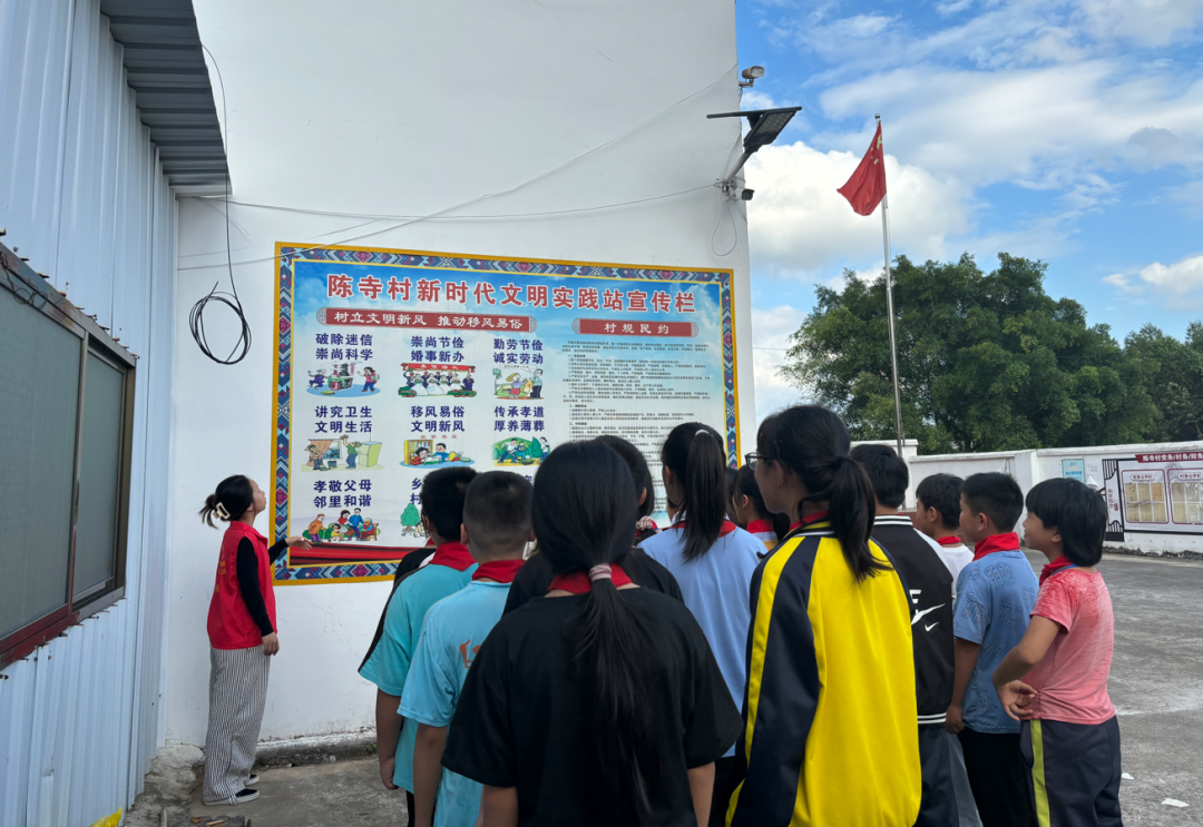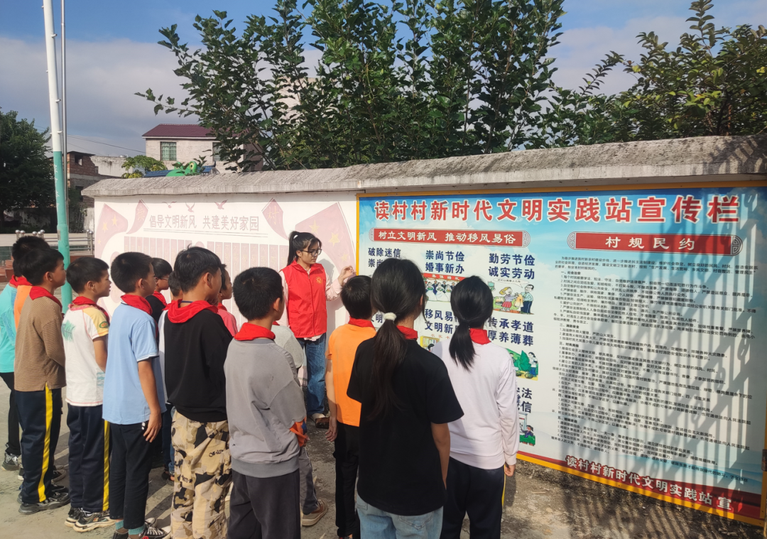 “破除迷信崇尚科学、崇尚节俭婚事新办......”在村委的新时代文明实践宣传栏前,志愿者正带领同学们共同学习移风易俗及村规民约的知识,让同学们对移风易俗有了更深刻而明确的认识,进一步引导大家树立文明和谐新风尚,争当移风易俗的传播者和倡导者。同学们纷纷表示将从个人做起,从现在做起,推动移风易俗,做到倡导文明节俭,抵制陈规陋俗和封建迷信,努力营造文明和谐的社会新风尚。