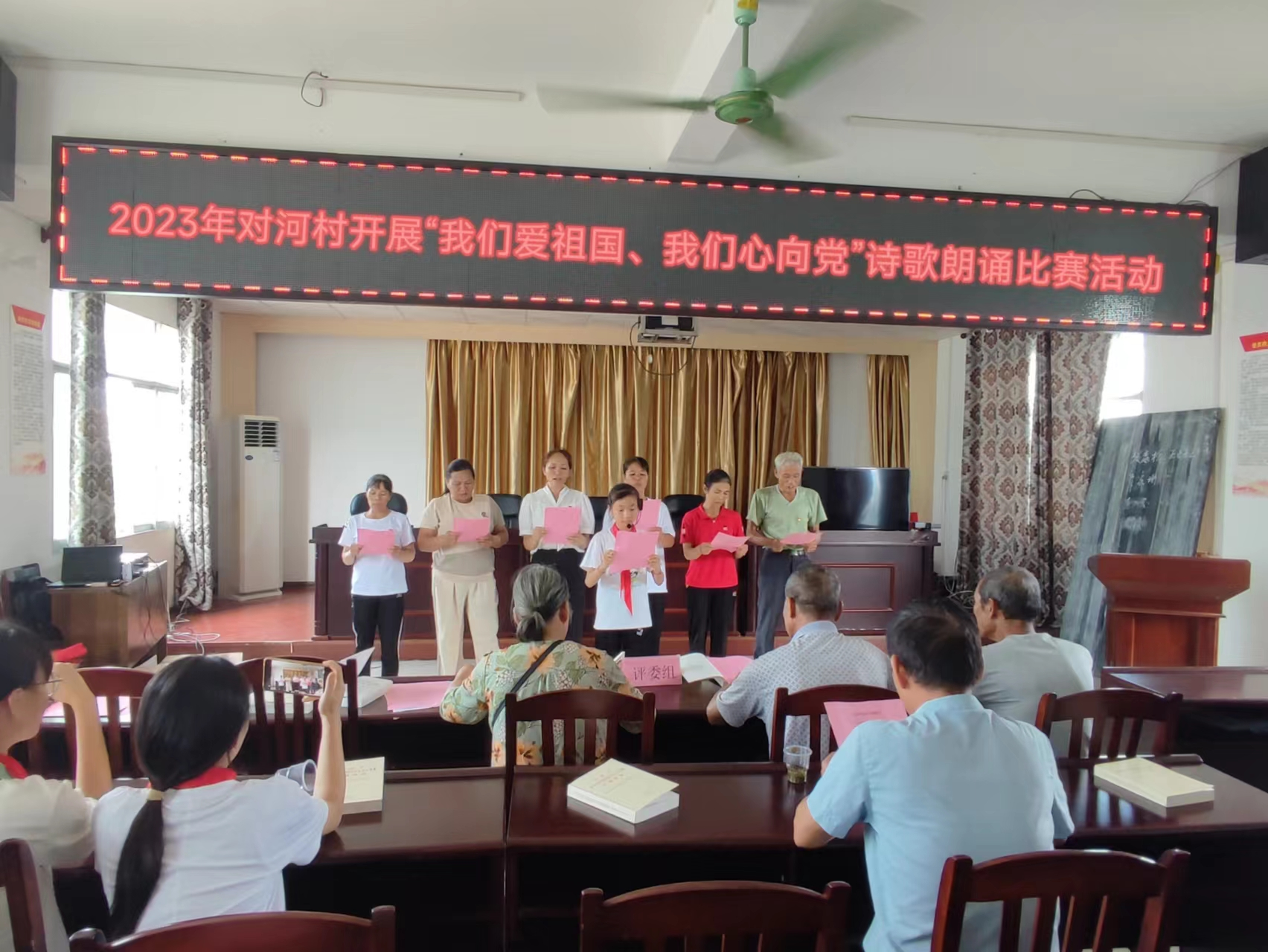 2023年10月1日,在对河村三楼会议室开展对河村“我们爱祖国、我们心向党”诗歌朗诵比赛活动。